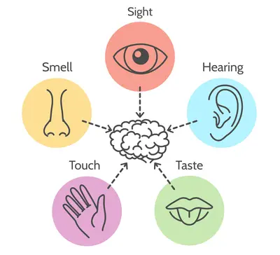 (Los cinco sentidos son vista, oído, gusto, tacto y olfato.)